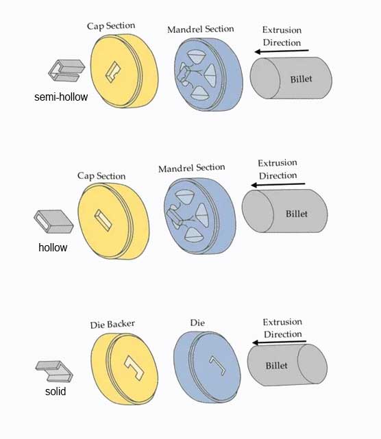 قالب اکستروژن آلومینیوم را بر اساس شکل و کاربردشان به دستههای مختلفی می توان تقسیمبندی کرد که هر کدام برای تولید پروفیلهای خاصی مورد استفاده قرار میگیرند. انواع قالب اکستروژن به شرح زیر :
